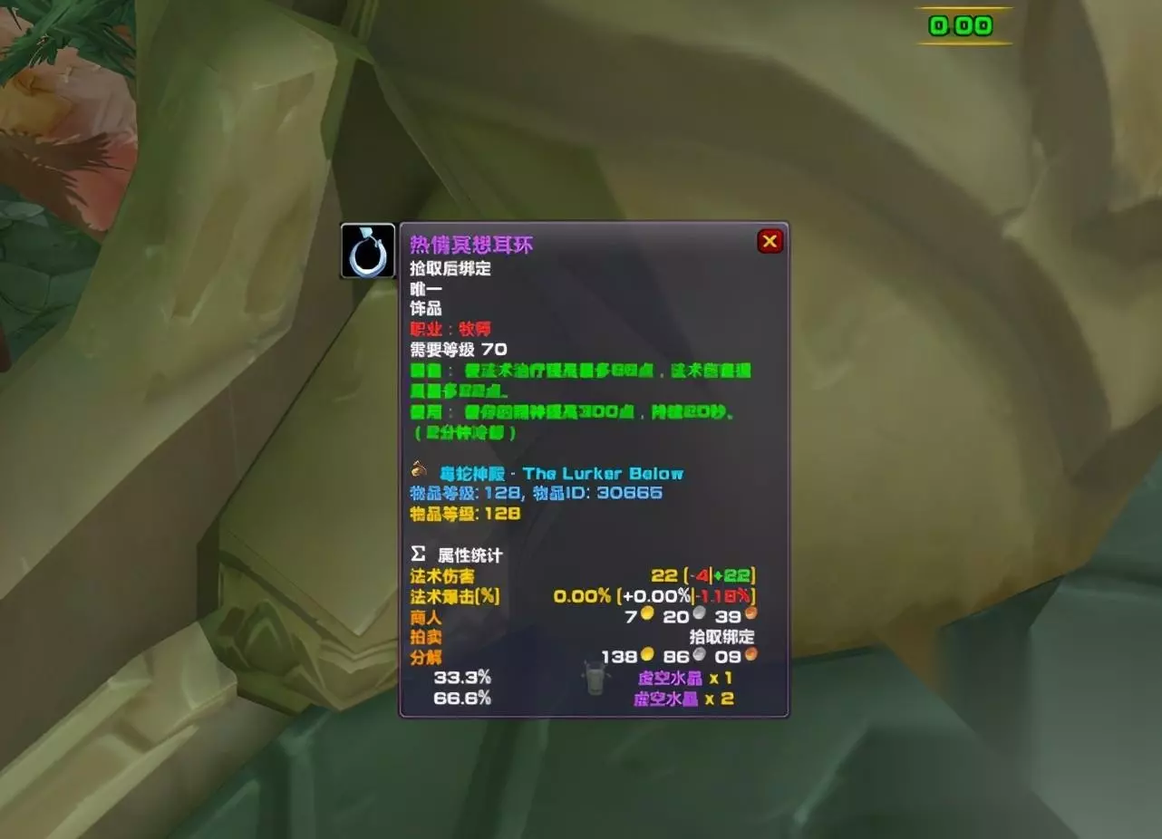 T5阶段开放之后,法师的主流天赋会变成奥法,而TBC版本限制奥法输出的因素就是蓝耗,这款饰品不仅可以提升法师的续航能力,还可以获得法强加成,基本相当于一个2分钟的爆发饰品了,因此对于休闲法师玩家来说,这款饰品完全可以用到毕业,等到祖阿曼开放之后搭配“妖术之颅”就可以了。 牧师饰品超极品 牧师的职业饰品名为热情冥想耳环,掉落于毒蛇神殿鱼拉斯,常驻属性为66点治疗效果,使用后获得300点精神,持续20秒,2分钟CD。