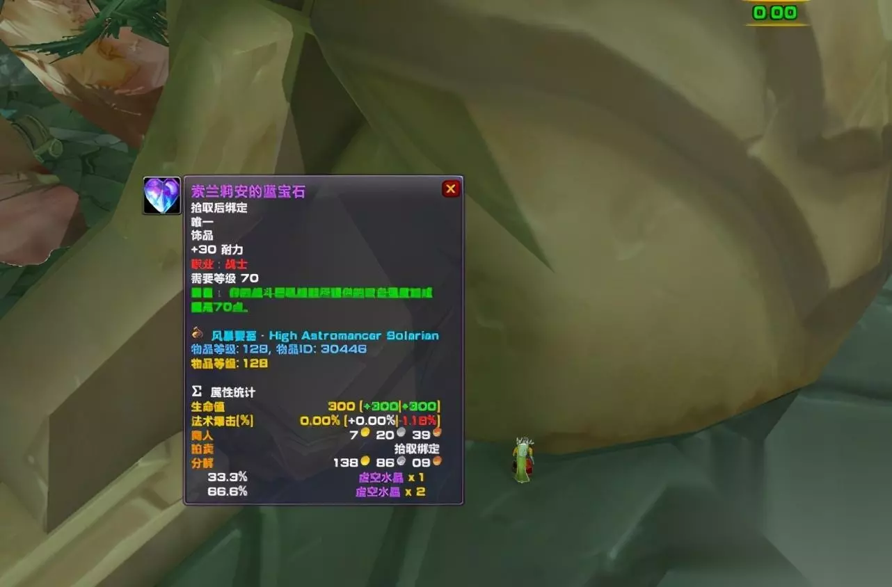 TBC版本P2阶段战士的饰品名为索兰莉安的蓝宝石,掉落于风暴钥匙的大星术师。索兰莉安的蓝宝石的主属性为30点耐力,使用效果为战斗怒吼获得70点额外攻强。
