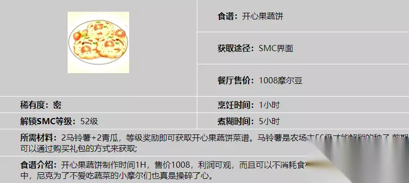 首先玩家要对开心果蔬饼的制作配方要有一定的了解,想要成功制作就得使用两个青瓜以及两个马铃薯,并且角色厨师等级要提升到五十五级才能解锁出制作条件,相信对于不少新人玩家来说,收集材料只是耗费一些时间就能完成,但是五十五级厨师等级却不是那么容易完成的。 所以在玩家解锁出厨师职业的时候,就需要对厨师等级进行快速升级,基本上游戏当中很多菜品制作都是会与厨师等级挂钩的,厨师等级越高的话,玩家所能制作出的菜品也会逐渐变多。