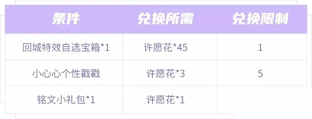 《王者荣耀》春暖花开送回城特效活动玩法攻略 活动时间: 2月16日更新后-3月1日23:59 特别活动: 收集许愿花兑换纸鸢寄愿回城特效 活动奖励: 参与活动收集许愿花送纸鸢寄愿回城特效自选宝箱 对局模式: 5V5匹配、排位、常驻娱乐模式、5V5标准人机模式、全民电竞模式 兑换详情: 45许愿花兑换获取1个回城特效自选宝箱 3许愿花可以兑换获取小心心个性戳戳,限量5个; 1许愿花可以兑换获取1个铭文小礼包,限制兑换100个