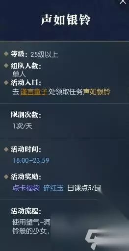 逆水寒手游声如银铃奇遇怎样完结 谨言童子方位:汴京(640,615) 每天都会有新的使命发布,每天18:00-23:59能够完结使命。