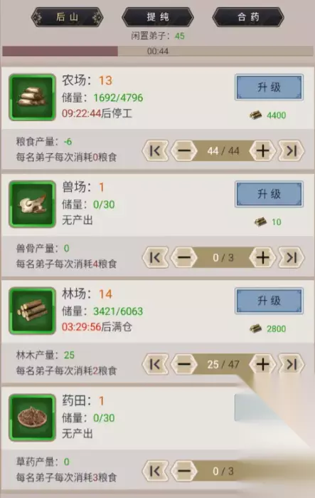 当初没有举行大典的时候我这些按钮是可以操作的,但是有没有闲置弟子我给忘了,有的话你可以试试提前搞,看其他攻略是主要升级林场和农场,当时这个让我迷瞪半天,愣是一点产出都没有,还是心不细啊,首先你得先产出粮食,才能制造木头,(木头和集市买的材料可不是一种),制造粮食无消耗,但是制造木头,一个人需要吃2点粮食,所以刚开始你可以3个人弄粮食,一个人搞木头,这样粮食在增加木头也在产出,如果粮食没有了或者停工了那就是0产出,我不知道这个是否能帮到你,但是这个地方确实是我走过的小坑。 然后开派大典每3个小时会来一个门派的掌门送弟子和钱,记得收,10点第一波,1点第二波,4点第三波,7点最后一波,这没啥好说的,不过需要注意的是,每一波你进去只能看到送钱没有弟子,这个时候你退出这个开派大典再进去就有弟子接手了,也在送钱那个地方左下角。 然后就是门派升级,门派升级》阵法升级》任务大殿》弟子宿舍》传功》功法》前期那个集市就不要搞,浪费我几十万材料,没点啥用,任务大殿最好是先搞到4级,可以做3个任务。 这个羊皮卷不要买,不到5级功法殿没开的情况下不要买,之后你做门派任务也会出,前期我买了十来个,花了好几万,最后一个蓝色任务能出10个,离了大普,推背石你自己考虑,这个玩意就是类似于抽卡,3个石头抽一个弟子,在聚贤庄龙门大会,25次保底紫,50次保底橙,75次紫,100次保底红。集市再升会有逆命丹啥的,用来刷弟子性格的,目前意义不大,不过有活动的话也可以开始有意无意的弄了。 阵法殿升级也是大量消耗材料,阵法升一级能上阵一个人,而且能转化不同的属性 二级开防御,辅阵值是你不要的弟子转化的分值,分值大小目前知道的是根据你弟子性格颜色决定,红色102分,橙色50左右,,这个可以用来增加你的气血和防御出售闪避命中等等。 目前这个阶段的弟子给不给武器没啥用,打不了一个2星门派,需要注意的是点弟子的头像可以送礼物,送到绿色就行了,然后右上角1进去设置挡刀,3这个位置忽略,我标错了。 之后到传法殿,给弟子传授武学,目前你只能给他传授提升内力修炼的武学,你有几个中意的资质都给传了,秒传而且免费,能加快弟子内力修炼速度。然后就可以再上面3的地方查看你传过的武学。 最后传内力是加快弟子升级的,每天可以两次,搞吧,弟子在吸你的血,这游戏好累啊。 其他的没有了,我这个也算是比较傻瓜的攻略或者介绍了,希望能帮到萌新吧,虽然我也是个萌新。