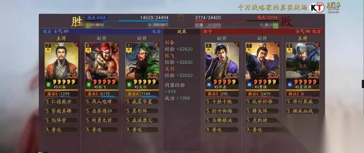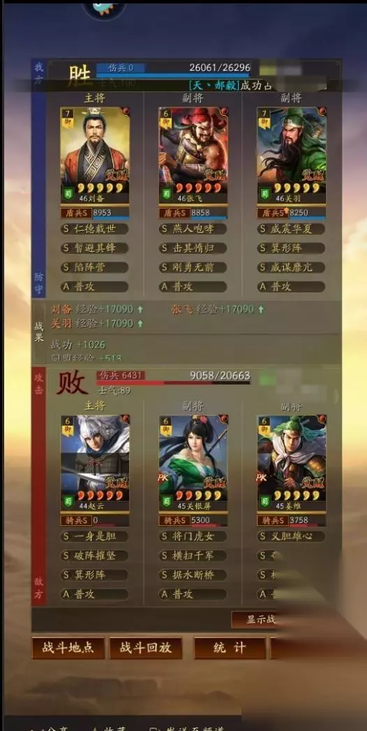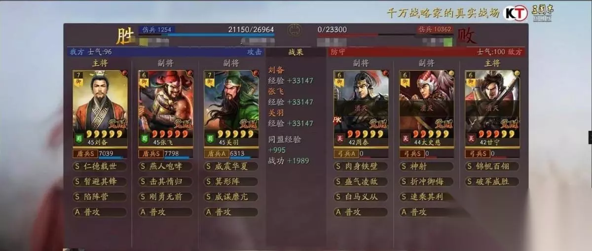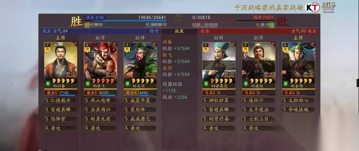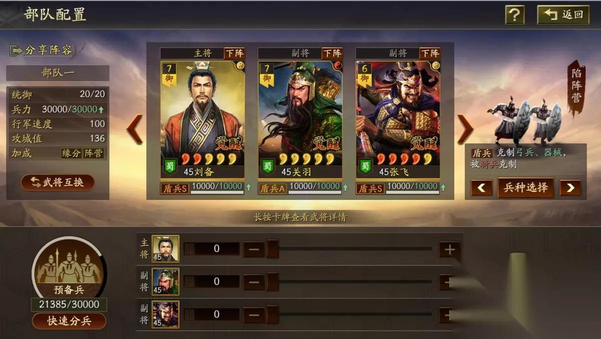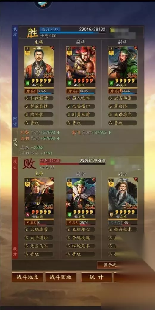刘备做主将是不怕箕形阵的,而且刘备可以点半统保护自己,暂避也能让自己扛住,所以只要刘备不死,打满八回合稳定能回五六千血撑住六回合,就需要减伤和回血战法,回血自身已经有了,那就是减伤战法的选择,一种桃园是靠暂避来撑减伤,但是暂避的缺点比较明显就是BUFF有可能会给到张飞,而关羽因为没有吃到任何减伤战法很容易暴毙!所以箕行阵必不可缺,这个阵容的稳定性,完全是靠箕形阵和威谋靡亢两个技能撑着。箕形套减伤,威谋加虚弱,配合桃园二将的高属性,几乎可以完美渡过八回合。在箕形和威谋之前,桃园则是控制见长,落凤是其标配,其目的也是靠控制替代减伤和虚弱效果。增强后的刘备就算白板也会有百分之6的减伤,配合箕行阵完美的弥补了关羽的处境。 兵书加点 主将刘备全智力加点兵书:援其必功 历军 驰援 副将张飞全武力加点兵书:胜而亦强 圣战 执锐 副将关羽30速度其余武力加点:后发先至 鬼谋 占卜 阵容思路 刘备 暂避其锋 陷阵营 关羽 威谋靡亢 箕行阵 张飞 刚勇无前 击其惰归 刘备作为辅助武将,自带的战法是仁德再世,可以每个回合治疗己方的武将,并且还有几率为敌方施加虚弱效果。其余的两个战法选择暂避其锋和陷阵营,陷阵营是盾兵的特殊兵种,可以把军队进化为陷阵营,不仅能提升武力和统帅还有概率获得援救效果,非常适合桃园队这样的纯兵刃组合。暂避让智力不在线的张飞,在面对法师队伍也有一战之力。 关羽自带的战法是威震华夏,效果是准备一个回合之后发动猛攻,造成敌方全体伤害,并且有几率进入缴械状态和技穷状态。关羽是既有控制又有伤害,威谋由是控制技能中最好的一个,能让桃园整个队伍拖住回合,并且由于缘分的纯在让桃园不仅有控制,奶量,减伤为一体,箕行阵有效的限制了队伍的主将输出。 作为整个队伍核心输出的张飞配合击其作为s8的一个事件战法,它让这个阵容又焕发了新的活力,同时在强度上也让其更上一层楼。如果小伙伴们还没这个战法的话,就能够借助定军山事件,带上夏侯妙才法孝直以及黄汉升这三人,就能去换一个了。而这个战法本身就是一个主动技,其释放概率为百分之四十,满级的话如果自身所受伤害高于最高兵力的百分之二十,将能恢复百分之二百九十六的兵力,同时还能提供减少谋略伤害的效果,不然的话能对敌方全体打出一次百分之一百五十四的攻击伤害,配合刚勇的会心,张飞的伤害直接达到了顶峰。 战报欣赏