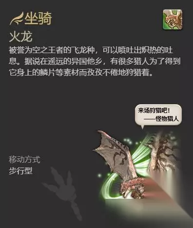 最终幻想14中有许多的坐骑,很多玩家都想知道火龙怎么获得,玩家可通过通关副本火龙上位狩猎战、火龙的上鳞兑换两种方式获得该坐骑,接下来就由小编给大家带来了详细的最终幻想14水晶世界火龙获得方法,希望这篇文章可以帮到大家! 最终幻想14水晶世界火龙获得方法: 通关副本火龙上位狩猎战、火龙的上鳞兑换获得 一、获得方法 1、首先玩家需要完成任务【其为赤空王者】开启副本【火龙上位狩猎战】;