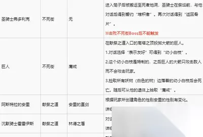 二、NPC长期事件 卡塔利纳的吉库巴尔多 1.在不死街通向献祭之道的高塔升降机处和他对话 2.乘坐升降机上行 吉库巴尔多会移动至塔的中部。 3.再次和吉库巴尔多对话。 吉库巴尔多在升降机通往最高层途中的隐藏入口处(可以听到他的声音)。 升降机分为两层,可以通过不乘坐一层升降机让它下行,来乘坐二层升降机前往最上层。 4.把广场上的炎之恶魔引到吉库巴尔多附近,他会起身和玩家一起战斗 5.一同击败恶魔后,和他对话 得到“吉库的酒”和动作“干杯”,再次对话得到动作“睡觉”。 6.幽邃圣堂区域,吉库巴尔多在井中,和他对话 幽邃圣堂的篝火“净身小教堂”出门右转的井中。 幽邃圣堂Boss房前的祭坛边岔路有升降机,上行后打开大门并刷新地图,随后才能触发事件。 已经得到卡塔利纳一套的情况下请直接参见第8条。 7.得到卡塔利纳一套 从传火祭祀场或者幽邃圣堂内出现的帕奇手中购入。 8.将卡塔利纳一套交给井中的吉库巴尔多 得到动作“举臂欢庆”。 9.在冰谷伊鲁西路和吉库巴尔多对话 穿过篝火“街道尽头的废屋”附近的下水道,在暖炉前(银骑士的附近)和他对话。 对话后得到“原力迸射”,再次对话得到“吉库的酒”,可回复HP。 ※注意,如果先前往伊鲁西路的地牢会跳过事件 跳过第9条支线的情况下,可以继续进行第10和11条支线。 但是第12条支线无法触发,击败约姆后刷新地图,可以拾取“风暴支配者”。 10.伊鲁西路的地牢区域,吉库巴尔多在牢房内,和他对话 地牢中巨人所在场所的附近有牢房,可在牢房外向他搭话。 第11条中拿到钥匙开门前可以隔门对话。 11.从罪之都可以去往吉库巴尔多的牢房方向,使用牢房钥匙开门和他对话 从篝火“罪之都”出发,爬下内侧的梯子后下行,前往左手边的建筑物,离开毒沼,登上毒沼附近建筑物外侧的梯子,在屋顶的宫廷魔法师附近,助跑跳跃至旁边建筑物的窗户处。需要“古老牢房的钥匙”。 对话后得到“楔形石原盘”。 12.进入罪之都Boss“巨人约姆”的雾门 动画后和吉库巴尔多共斗。(无需触碰印记召唤他) 击败约姆后,和他对话得到“吉库的酒”。 到他睡着为止和他对话,接着和吉库巴尔多拉开一定距离后(无需刷新地图)玩家在得到灵魂的同时,还可以在吉库巴尔多所在的位置拾取“卡塔利纳一套”,“穿刺盾”,“风暴支配者”。 ※吉库巴尔多被巨人约姆打倒的话,依旧能得到装备但不会有对话。 不死街的格雷拉托 1.在罗斯利克的高墙和他对话,选择“听取请求” 地点是篝火“高墙之塔”下层的牢房(需要牢房钥匙)。 对话后得到“蓝色泪石之戒”,格雷拉托将移动至祭祀场。 随后可以在祭祀场向他购买物品。 2.将“洛莉塔之骨”交给他 从不死街的遗体上拾取“洛莉塔之骨”。 刷新地图后再次对话,得到动作“蜷缩”。 3.进度推进至不死街,选择“让他出发去行窃” 格雷拉托会离开祭祀场,玩家击败1个Boss后回归。 回归后出售的商品增多。 4.玩家到达冰谷伊鲁西路后,再次让格雷拉托出发行窃 根据条件不同支线有分歧。 [有推进卡塔利纳的吉库巴尔多相关支线的情况下] 攻略冰谷伊鲁西路前必须将吉库巴尔多的支线推进至第8条。 4.i和4.ii首先完成哪一项对推进支线都没有障碍,但以下两个条件是共通的。 『在满足格雷拉托的生存条件前不可击败任何一个Boss』 『不可先行前往伊鲁西路的地牢,此举会导致吉库巴尔多移动』 4.i.到达冰谷伊鲁西路的篝火“伊鲁西路市街”后,让格雷拉托出发去行窃 此后,如果不满足4.ii.中所写的条件,先行击败了一个Boss的话会导致格雷拉托死亡。 4.ii.和暖炉前的吉库巴尔多对话 吉库巴尔多相关支线的第9条。 如果玩家在和吉库巴尔多会面前,先行经过篝火“街道尽头的废屋”前往地下的伊鲁西路地牢的话,会跳过暖炉前对话的事件。 而没有暖炉前的对话事件会导致出发行窃的格雷拉托死亡。 4.iii.击败一个Boss 冰谷伊鲁西路的教皇沙利万或者是烟熏之湖的恶魔老王等,击败任意一个即可。 击败后,格雷拉托回归祭祀场。 [有推进不屈的帕奇相关支线的情况下] 帕奇登场,并且玩家没有从他手中购得卡塔利纳一套的情况下。 由于吉库巴尔多不会在暖炉前出现,因此将格雷拉托的情报告知帕奇会为格雷拉托的生还提供条件。 4.i.到达冰谷伊鲁西路的篝火“伊鲁西路市街”后,让格雷拉托出发去行窃 4.ii.和祭祀场内的帕奇对话,选择“告知格雷拉托的行踪” 让格雷拉托出发去行窃后,他会离开祭祀场,确定格雷拉托离开再和帕奇对话。 4.iii.确认帕奇已经离开祭祀场 告知帕奇有关格雷拉托的行踪后,也不要马上就去击败Boss以求触发格雷拉托的回归。 请务必确认帕奇已离开祭祀场,随后再推进事件。 4.iv.击败一个Boss 冰谷伊鲁西路的教皇沙利万或者是烟熏之湖的恶魔老王等,击败任意一个即可。 击败后,格雷拉托回归祭祀场。 [没有推进吉库巴尔多和帕奇支线的情况下] 击败Boss后格雷拉托死亡,可在伊鲁西路下水道内的某具遗体上拾取“格雷拉托的遗灰”。将遗灰交给祭祀场侍女,侍女商店追加的商品和格雷拉托回归后追加的商品相同。 5.玩家到达罗斯利克城后,再次让格雷拉托出发行窃 让他出发行窃后格雷拉托死亡,可在大书库内的某具遗体上拾取“格雷拉托的遗灰”。 目前没有找到格雷拉托的生还条件。 此时将遗灰交给侍女,之前格雷拉托所贩