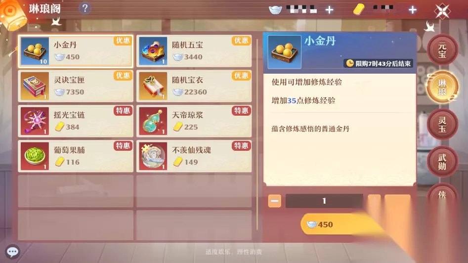 琳琅商城,银两每天购买,银两主要做任务给。每天值得换的有小金丹、阵法书、随机宝链、随机神石、随机五宝、黄金鸟、拜帖、天玄宝图。还有几率出现像是摇光神石、神兽玉玦、蜃珠、坐骑残魂这类物品。 灵玉商城,主要是神州话本、精英据点、仙师试炼获取。每天换50个玄晶。一周一次换神铸令、混元金丹、宝石灵匣。