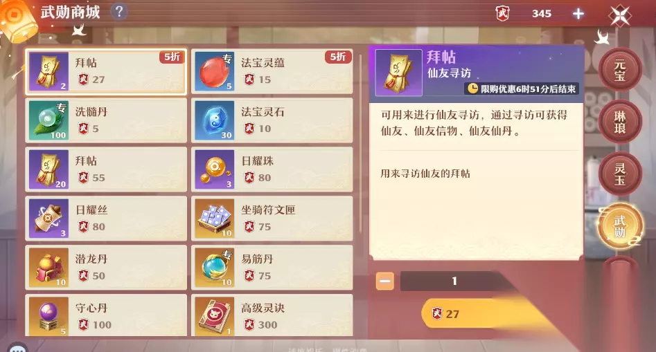 武勋商城,主要是每天群英榜、仙盟乐斗、天玑排位、首席之争获取。每天换2个拜帖、5个法宝灵韵。每周换悟道丹、高级灵诀、寒烟雪残魂。 侠义商城,帮扶新人、行侠仗义每天能攒400侠义值。每周可获得混元金丹和宝石灵匣。