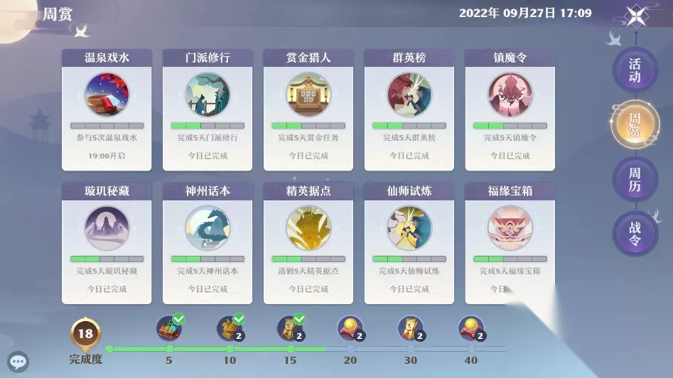 周赏: 完成每日任务获取,一周一次奖励获得宝石灵匣、黄金鸟、拜帖、混元金丹、神铸令。 战令: 完成每日任务获取经验值,每天奖励2个战令异宝。 仙友: 寻宝免费1次,每天可以获取小金丹、混元金丹、宝石袋、仙缘、各色仙友。 帮派: 帮派商店产出,上交资料、净化星阵、星石守护、温泉戏水、帮派竞赛、以及帮扶新秀做一条都可以得到一些帮贡。每天领取免费的灵兽经验丹1个。每周帮贡还可以换取天玄宝图、高级灵诀、小金丹、混元金丹。 招新: 每天有免费的灵兽经验丹一个可以领取。 仙府: 山庄灵气,免费获取,每天领1次山庄灵气。一周一次古神祭祀给三级图、货船订单随机给三级图。 上供加打败古神,一周一次购买三级家具图。 货船订单,上交物资,一周一次购买物资、随机三级家具图、随机高级树种、随机高级花种。