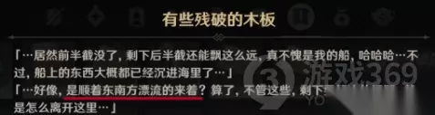听从派蒙的提议,我们决定去找找另外的半截船。根据木板上所说,我们发现的是"后半截船",上面说他是顺着东南方向漂流的。