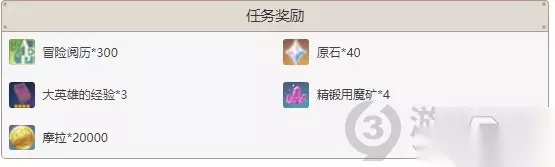 任务完成后玩家可以获得冒险阅历*300,原石*40,大英雄经验*3,精锻用魔矿*4,摩拉*20000。