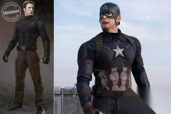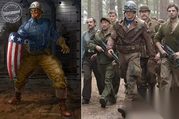 《美国队长1》早期的美队制服曾经出现过一款蓝色夹克搭配土黄色工装裤的设计,“工农兵”画风浓重。Meinerding解释说:“蓝夹克这版设计最终被弃的原因是,这让美队看起来不太像一个战士,感觉有点显摆。”