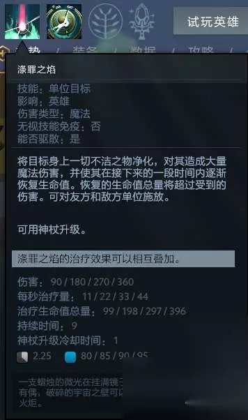 关于技能的介绍,笔者决定先从涤罪之焰说起。这个技能是神谕者的灵魂技能,也是其两面性的根本技能。神谕中期的主要爆发点以及奶人的关键就是这个技能。之后的搭配会在其他技能中详细介绍。简要的说就是一个短CD长施法距离的没有弹道的瞬间的爆发,然后再慢慢的回血的技能,对友军不致死。满级伤害计算魔抗大约270左右,也就是说在前中期血条少于一格可以直接秒杀。如果秒杀计算错误的话,让对方开始回血将会是一件很麻烦的事情。奶量差大概是120左右一个,适合在战后进行对队友的回复(尤其带有魔抗的)。