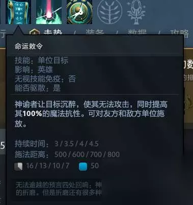 一个缴械+魔抗100%的技能,注意不是魔免,是一个100%的敌法师的被动的感觉。配合涤罪之焰可以免除伤害进行加血。也可以用这个来克制非常非常多的法系爆发英雄,例如天怒法师,火龙果,火猫这种。对于美杜莎这种站桩输出的缴械也非常克制。而这个技能作为Debuff,是可以被气运之末驱散的。所以在给队友加血而突然战斗的时候,可以用气运之末将其驱散。