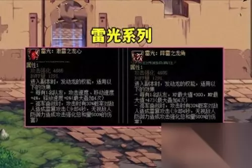【五】雷光系列 基础攻击“上衣+4685、下装4868、腰带+6213、头肩+5861、鞋子+6213”,5件一共27657,分为“组队Buff:三速、防御、暴击”和“单刷Buff:特效伤害”两类,出场率不高,辅助职业专属。