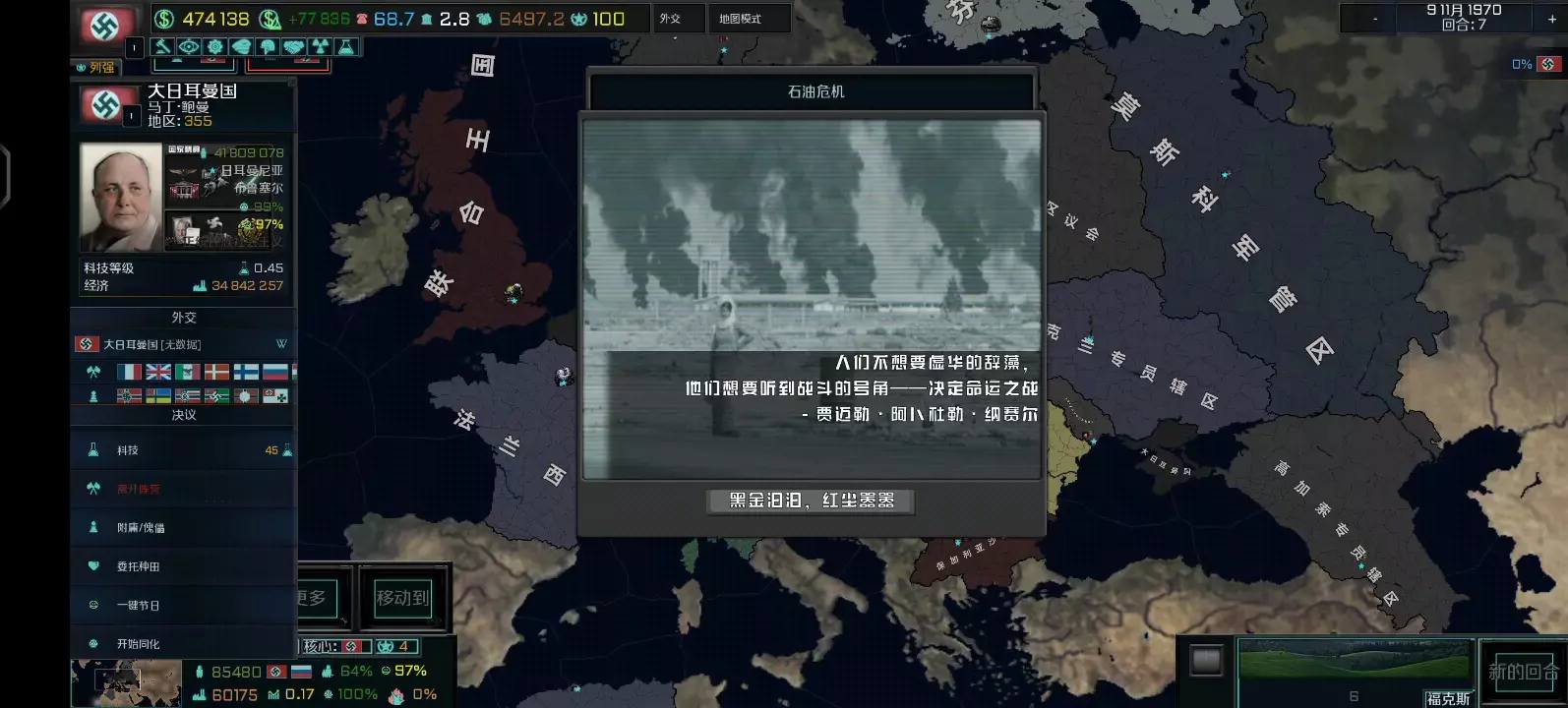 这是TNO架空mod的娱乐向内容,展示了以赫尔曼·戈林为首的大日耳曼国的作战场景,因戈林的经济“奇迹”,该国需采取闪电战,画面呈现了多区域的军团作战、国策树推进等游戏内容。