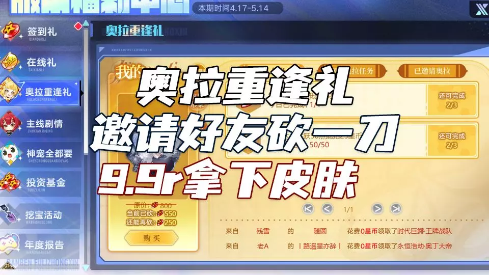 奥拉星在4.17-5.14开启奥拉重逢礼拉人回归活动,花费9.9元可抵扣800星币,能从多款售价800星币的至臻皮肤等奖励中选1个领取,完成指定任务还可最低0星币获取奖励。