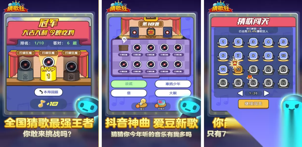 这款魅力十足的猜歌类游戏具有超大的曲库,曲库中的经典老歌、流行歌曲的种类十分丰富,悦耳动听的音效配合简单的猜谜规则深入人心,清新简洁的画面UI也为本作提高了观赏性,轻松上手的猜谜类玩法是吸引了许多音乐类游戏爱好者,众多趣味玩法也在这款音乐类游戏中等你来体验,自认为自己是猜歌高手的小伙伴还在犹豫什么?安装这款非常硬核的歌曲猜谜手游尝试吧。 高速下载 普通下载 6、《猜歌大赢家》