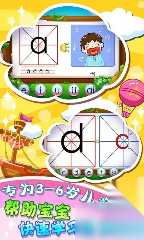 《初级汉语拼音》有着极其丰富的韵母表供孩子们查看,同时内置了非常便捷的搜索功能,能够有效引导玩家们去自行搜索想要学习的拼音字母,只要轻触屏幕上的字母,孩子们就能听到真人演绎的标准发声,并且游戏内加入了形形色色的卡通图片,每一幅图片都巧妙蕴含了经过抽象化处理的拼音字母,而且每一个声母和韵母都会有对应的偏旁部首让孩子们查看。 手机扫码下载233乐园APP预约 预约订阅最新动态 优先233乐园APP下载 3、《拼音猜词语》