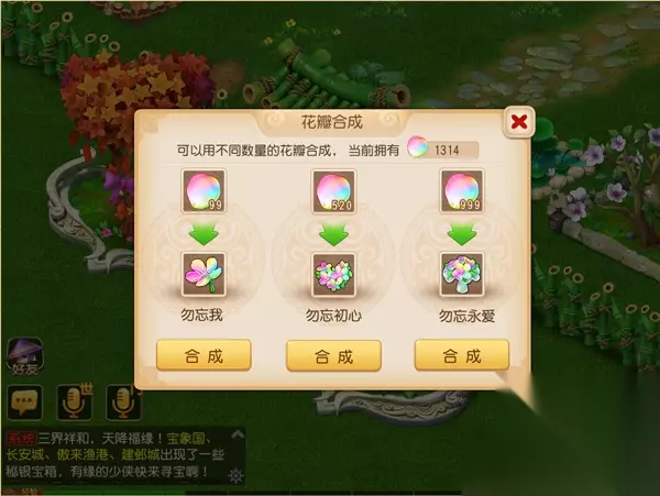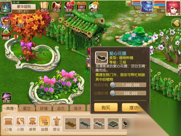 无论是什么规格的庭院,都可以摆放2个爱心花圃。爱心花圃摆放在庭院外的区域,玩家可以自由移动位置。 在爱心植物结出果实后,栽种花的人、房主及配偶都可以摘取果实。食用果实可以得到勿忘我花瓣。采摘果实时,照顾过花的人也有几率获得勿忘我花瓣。 勿忘我花瓣可以赠送给其他玩家,也可以将勿忘我花瓣进行合成。99个花瓣可以合成勿忘我,520个花瓣可以合成勿忘初心,999个花瓣可以合成勿忘永爱。合成的道具可以用来赠送给好友,为好友增加人气。