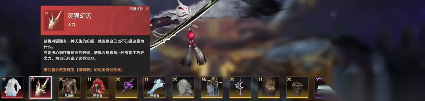 亮红绸缎披身而下,似红莲业火般生长蔓延,宛如仙女下凡,披星戴月! 至阴之时,昆仑山顶,天河赤红。漫天星斗绽放璀璨光辉,顺月光洒下颗粒星尘,星月点点相映,终而名曰红夜~ 除了这些令人瞩目且璀璨闪耀的新衣服之外,劫宝发现宝箱内还有同样好看的武器皮肤 、配饰和表情! 灵狐幻刃 | 太刀