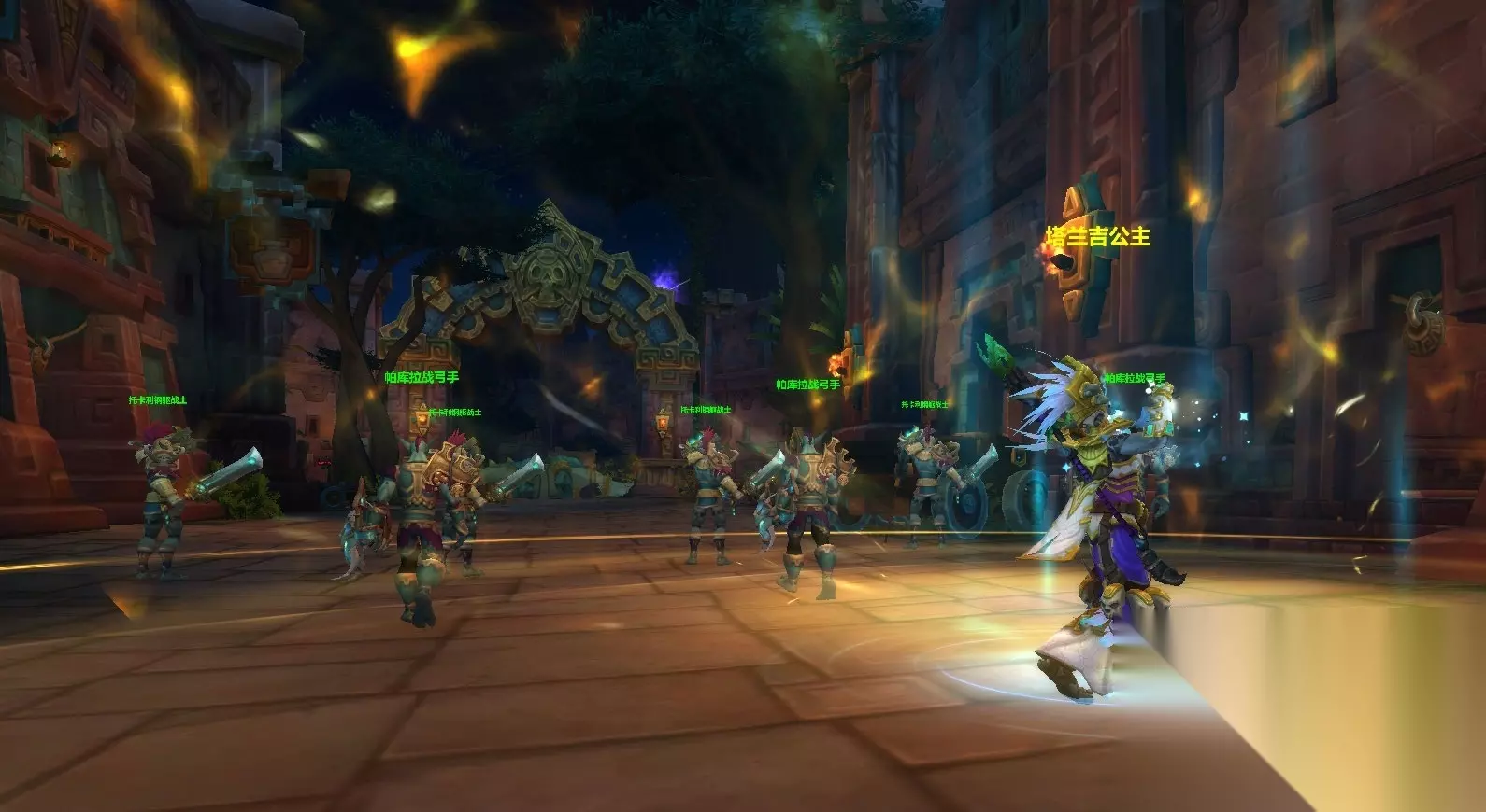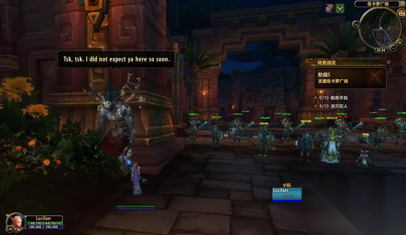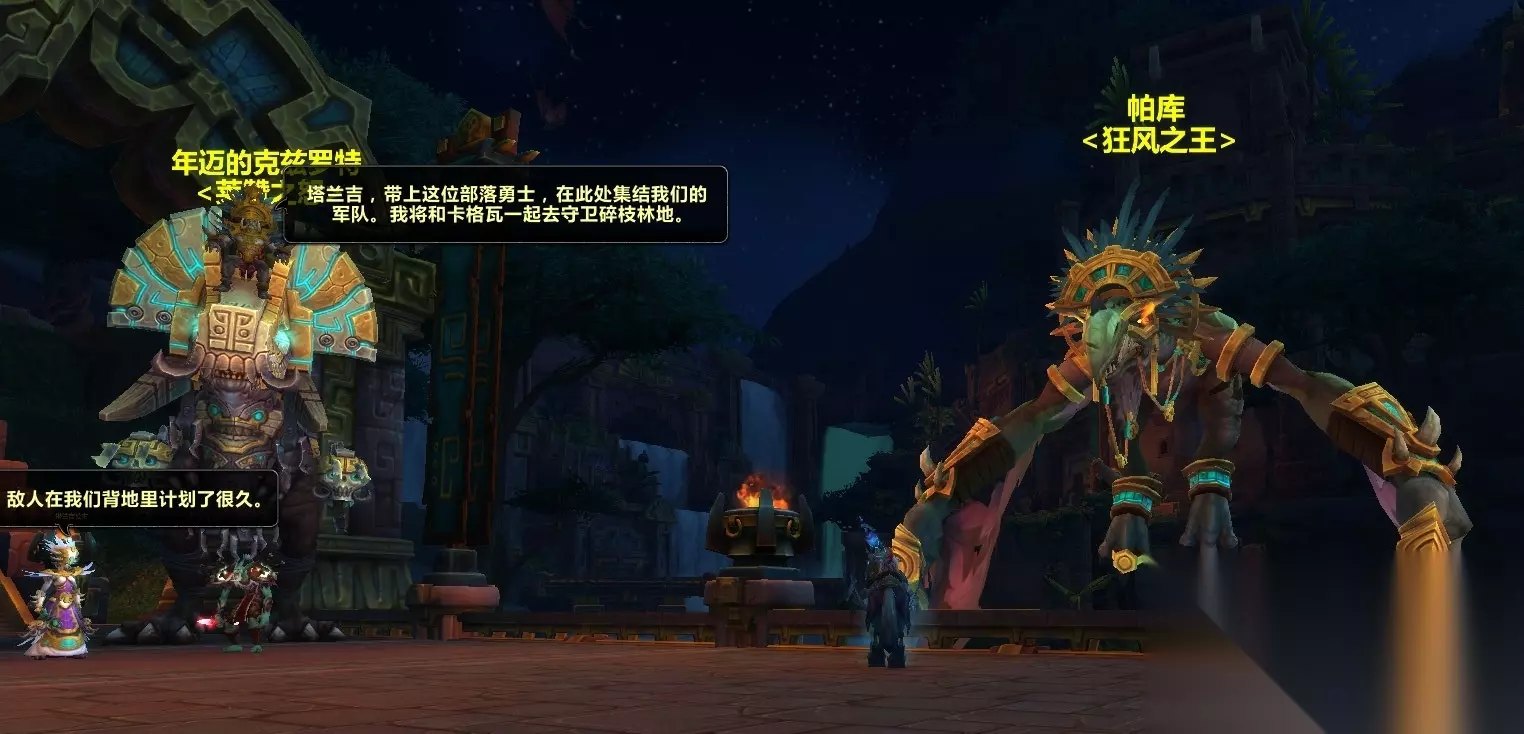 来到佐卡罗广场,我又见到了老朋友戎卫莱克拉。我们准备一起抵御蛇人的进犯 戎卫莱克拉:列阵!弓箭手准备。 塔兰吉公主:莱克拉,原来是你在指挥我们的军队。 戎卫莱克拉:塔兰吉,原来是你在骑着洛阿作战。 塔兰吉公主:非常时期得用非常手段。情况怎么样了? 戎卫莱克拉:很糟糕。侧翼被攻击了。洛阿神灵在尽其所能,但是我们需要集结所有还能作战的巨魔。