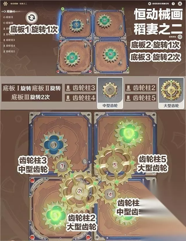 原神恒动械画稻妻之二怎么过 1、底板Ⅰ旋转1次 2、底板Ⅱ旋转1次 3、底板Ⅲ旋转2次 4、齿轮柱2装大齿轮 5、齿轮柱3装中齿轮 6、齿轮柱4装中齿轮 7、齿轮柱5装大齿轮