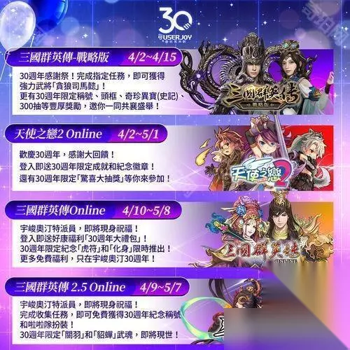 30 周年活动开跑 精彩可期! 宇峻奥汀欢庆 30 周年,为感谢玩家长年的支持,官方精心策划全年庆典,集结旗下经典游戏,推出一系列惊喜联动、福利活动、限定道具等精彩内容。庆祝活动接连登场,诚挚邀请旧雨新知共襄盛举,一同让快乐延续!