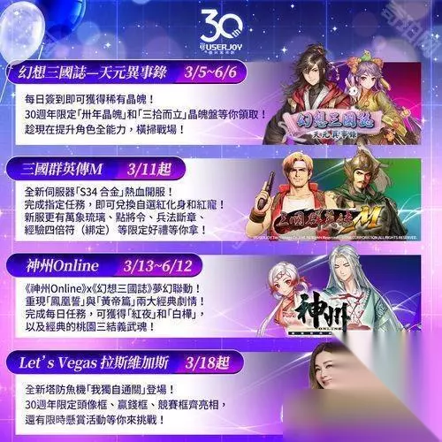 继《三国群英传 M》和《合金弹头 X(俗称:越南大战 X)》合作上缐后,宇峻奥汀3月14日宣布,《神州 Online》将与《幻想三国志》展开合作,该内容将重现《幻想三国志》资料片「凤凰誓」与「黄帝篇」两大经典剧情,带玩家重温这段扣人心弦的情节。 宇峻奥汀迎来 30 周年里程碑,三十年来始终坚守初心,自制研发《超时空英雄传说》、《三国群英传》系列、《武林同萌传》(原名:新绝代双骄)、《天使之恋》、《幻想三国志》系列、《拉斯维加斯》和《英雄传说 轨迹系列》等经典作品,与玩家共创无数珍贵回忆。 官方集结旗下多款经典作品,推出 30 周年庆祝活动,并惊喜宣布两大重磅联动—《合金弹头 X》(俗称:越南大战)与《幻想三国志》相继登场,精彩内容不容错过!