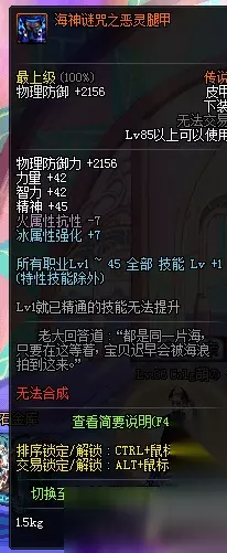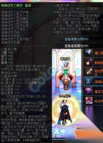 [3]套装效果 四围+70。 在地下城中装备时,每消耗一颗天界珍珠,将赋予武器冰属性,持续30s。 [5]套装效果 HP+250、MP+250、攻速+3%、移速+2%、释放+3%。 攻击诅咒状态下的敌人时,附加20%白字伤害。 装备后每10s使周围500px的敌人进入诅咒状态5s,诅咒状态下的敌人四围-50。 HP在15%以下时,被攻击的时候消耗恶灵的密语,使得自己恢复100%HP,同时减少12%HP并使所有敌人进入诅咒状态7秒,诅咒状态下的敌人四围-50(异常等级Lv90) [6]套装效果 装备后,减少周围500px敌人诅咒抗性25点 每20s使周围500px的敌人进入诅咒状态10s,诅咒状态下的敌人四围-50。(异常等级Lv90) 幽灵套海神迷咒之愤怒改版效果图: