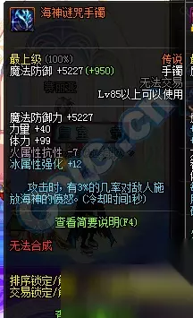 手镯:火抗-7,冰强+12,攻击时有3%几率对敌人释放海神愤怒,CD1s