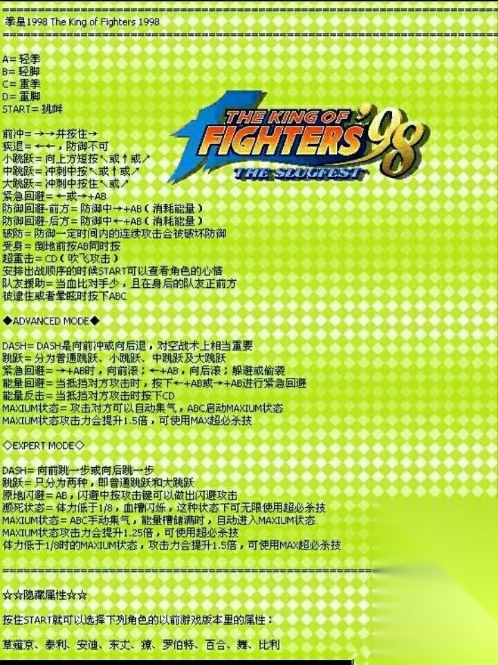 1.按键分配A = 轻拳B = 轻脚C = 重拳D = 重脚START = 挑衅2.动作按键前冲 = →→并按住→疾退 = ←←,防御不可小跳跃 = 向上方短按←↑或↑或↑→中跳跃 = 冲刺中按←↑或↑或↑→大跳跃 = 冲刺中按住←↑或↑→紧急回避 = ←或→ AB防御回避-前方 = 防御中→ AB(消耗能量)防御回避-后方 = 防御中← AB(消耗能量)破防 = 防御一定时间内的连续攻击会被破坏防御受身 = 倒地前按AB同时按超重击 = CD(吹飞攻击)安排出战顺序的时候C可以查看角色的心情队友援助 = 当血比对手少,且在身后的队友正前方被逮住或者晕眩时按下ABC 下面是角色技能表: