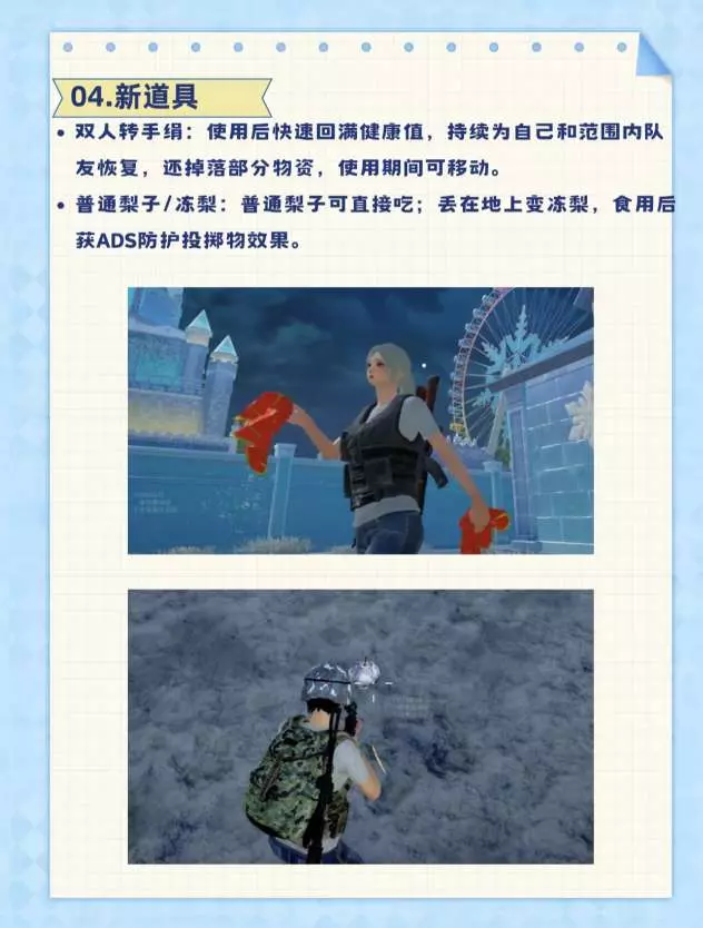 ·普通梨子/冻梨:普通梨子可直接吃;丢在地上变冻梨,食用后获ADS防护投掷物效果。