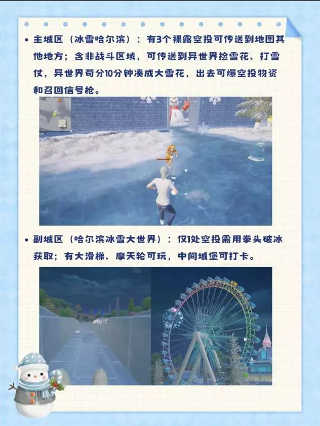 ·主城区(冰雪哈尔滨):位于水城位置,有3个裸露空投可传送到地图其他地方;含非战斗区域,可传送到异世界捡雪花、打雪仗,异世界苟分10分钟凑成大雪花,出去可爆空投物资和召回信号枪。