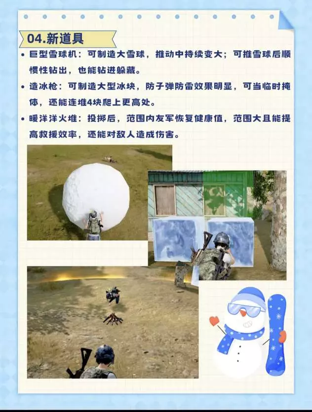 ·巨型雪球机:可制造大雪球,推动中持续变大;可推雪球后顺惯性钻出,也能钻进躲藏。