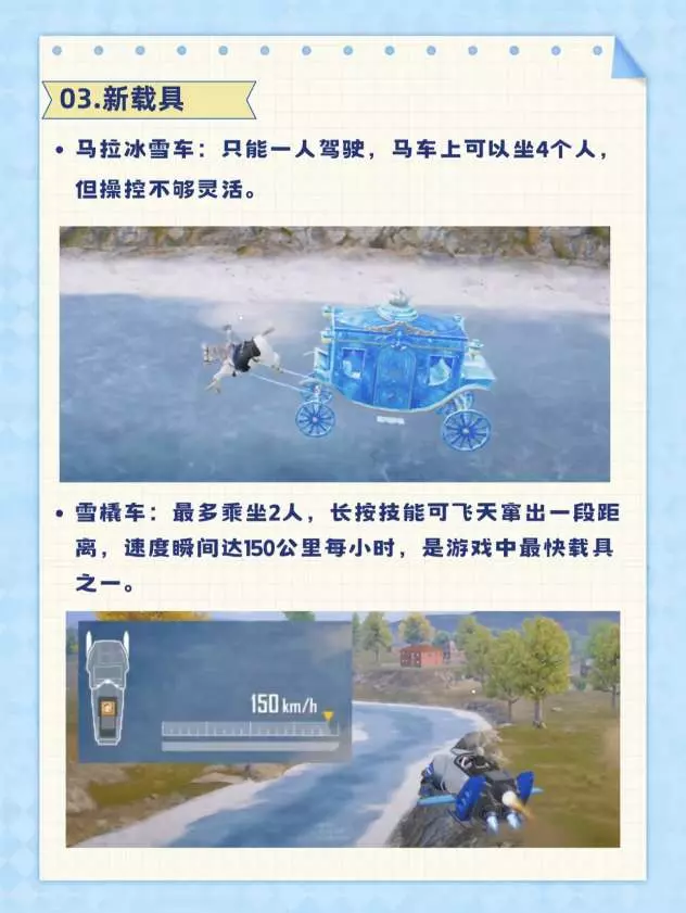 ·雪橇车:最多乘坐2人,长按技能可飞天窜出一段距离,速度瞬间达150公里每小时,是游戏中最快载具之一。