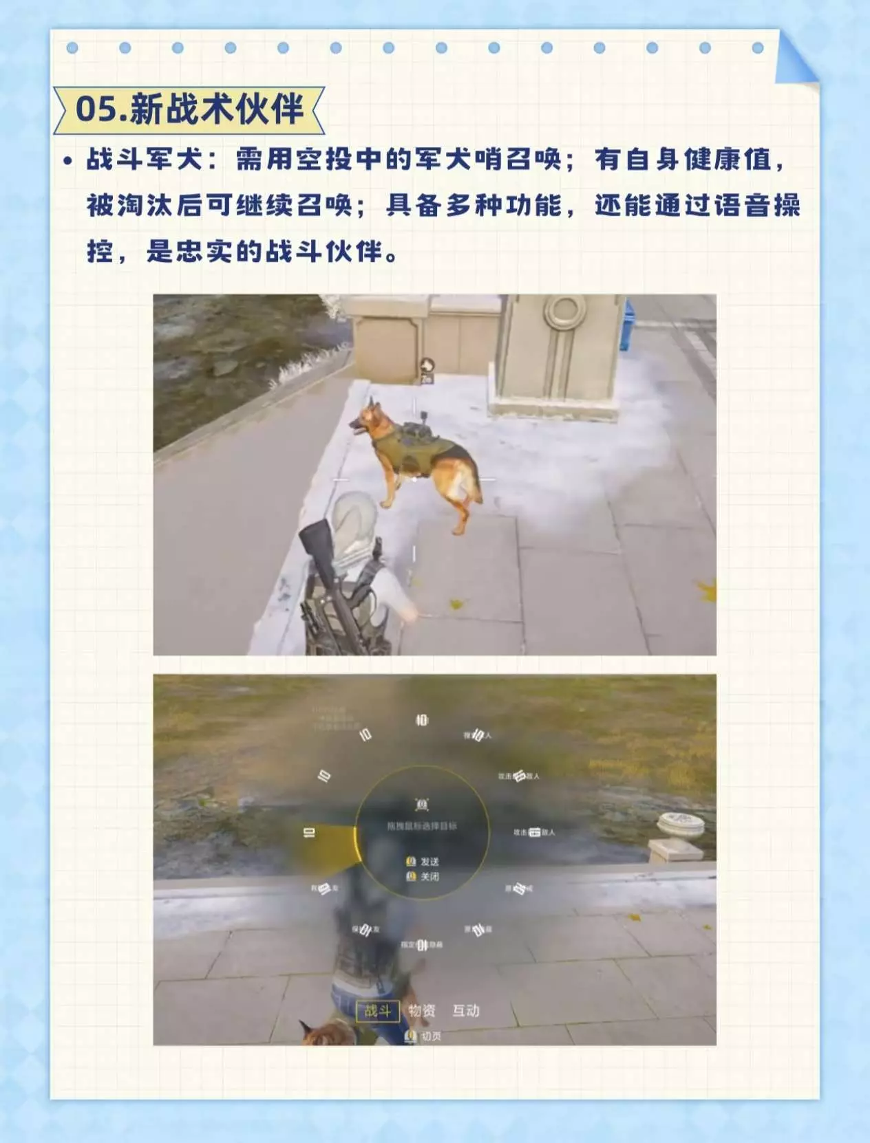 ·战斗军犬:需用空投中的军犬哨召唤;有自身健康值,被淘汰后可继续召唤;具备多种功能,还能通过语音操控,是忠实的战斗伙伴。