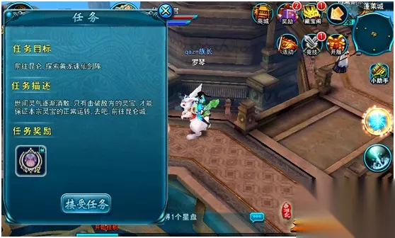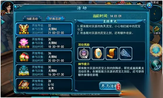 【活动玩法】 每日21:00活动开启后,所有等级在32级以上的角色均可通过【活动】按钮中的“直捣黄龙”选择[参与活动]按钮即可自动寻路至主城活动NPC伏魔真君处,领取任务后,前往指定的敌对宗派的主城中特定位置进行探索即可完成任务,获得白色星盘*2的活动奖励。 同时在活动开启后,玩家还可以攻击并摧毁敌对宗派的灵宝剑阵来获得更高奖励,最后一刀击毁剑阵的玩家和同屏幕所有同家族的成员均将获得:(复活石*2、半小时双倍经验卡*1、白色拓石*6、白色星盘*1)中的任意一种奖励。 Ps:三个宗派的灵宝剑阵分别为:【阐宗-诛仙阵●昆仑】、【截宗-镇魔剑●蓬莱】、【道宗-斩妖剑●方壶】