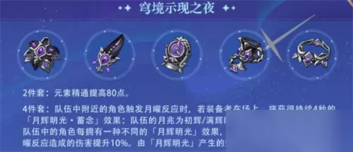二、穹境示现之夜 2件: 元素精通提高80点。 4件: 队伍中附近的角色触发月曜反应时,若装备者在场上,将获得持续4秒的「月辉明光·蓄念」效果:队伍的月兆为初辉/满辉时,暴击率提升15%/30%。队伍中的角色每拥有一种不同的「月辉明光」效果,队伍中的所有角色触发的月曜反应造成的伤害提升10%。由「月辉明光」产生的效果无法叠加。