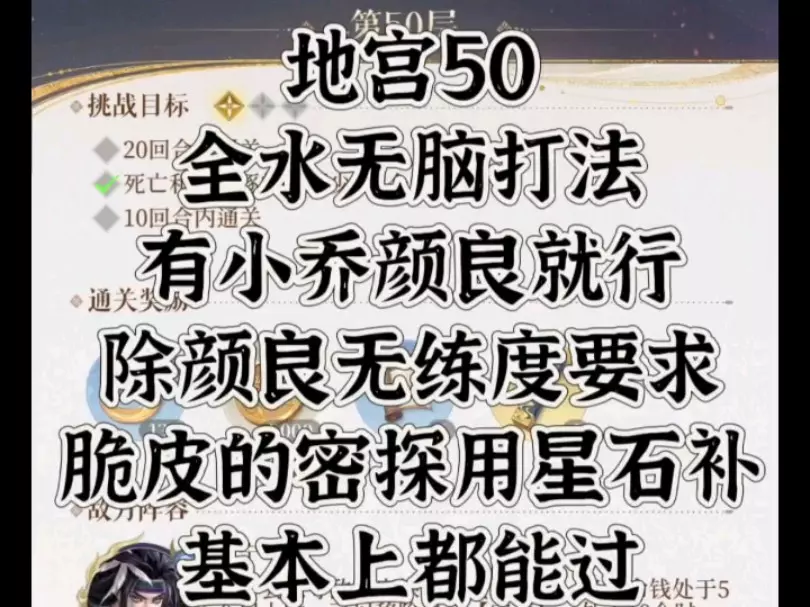 地宫50无脑全水系阵容打法,练度要求极低,要求有小乔、颜良练度够,没有孔融可以用其他辅助性质的水系密探代替,只要颜良盾够厚、辅助及时回血保证阵容完整基本上都能过…