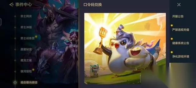 2、进入到事件中心在右侧的导航栏当中下滑倒数第二个是口令码兑换,点击立即前往输入自己的口令码即可兑换资源。
