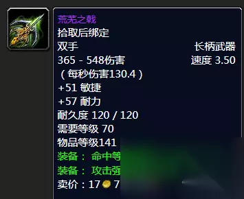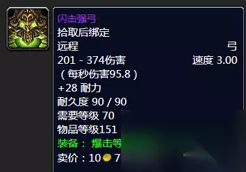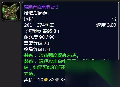 背叛者的黑暗之弓 对于喜欢长柄武器的来说荒芜之戟肯定是直接带到太阳井等魔脊之枪了。而如果有喜欢拿主副手的那么无尽的痛苦搭配恶行之刃也是相当的不错的。综合来说还是不相上下的! 最后我们来看看弓,到底是黑弓好还是闪击强弓牛呢?这个问题其实一直是很多玩家疑惑的,当然基本上在万年TBC年代的话黑弓确实用的人很少。但是喵叔可以和你说黑弓真的不差,两把弓来说无论速度、秒伤以及伤害区间都是一模一样的,抛开回蓝和耐力的话也就是对于攻强和爆击的选择。 真的比较下来闪击强弓估计也就好上那么一丢丢,但是也就是那么一丢丢并不影响你的整体输出,如果目前玩家还是以往不看好黑弓的情况的话,喵叔可以推荐大家大胆放心的低价购入,性价比真的好。当然颜值的话应该是闪击完胜的! 推荐完毕,喵叔双手不停地戳天花板,你们是不是应该要给我点掌声,谢谢,谢谢大家! 好了,时间关系,那么今天喵叔呢就简单地给大家介绍喵叔能够回忆起的一些那些年TBC前期P3阶段中猎人阶段性毕业的BIS巅峰装备,也把它们推荐给你们,大家如果觉得有什么需要补充的话欢迎评论区留言与喵叔一起分享,谢谢! PS:也希望大家能够在现如今快餐化时代的游戏大环境中不忘初心,能够重拾自己当年的那份魔兽情怀! 魔兽世界,我们的另一个世界!