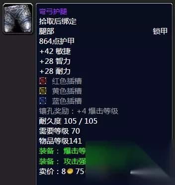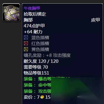 午夜胸甲 虽然是皮甲胸,但是三插槽高命中超强爆击以及一流攻强来说都是你的好选择,如果前期部分玩家对于T6真的竞争不下的话,其实这款还是性价比可观的,主要小黄人也少,这款装备个人感觉价格不会太过高,总体性价比也可以的,大家届时也可以考虑一二。 推荐指数统统满天星辰直戳天花板,我戳我戳我戳戳戳! ⑥护腕