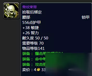 阿加多的腰带 腰带的话猎人可以优先入坑这款海加尔山BOSS安纳塞隆出品的阿加多的腰带,黄字认证可见一斑。高敏捷高耐力双插槽可谓优秀,爆击攻强也是不错。带到T6腰带丝毫没问题。