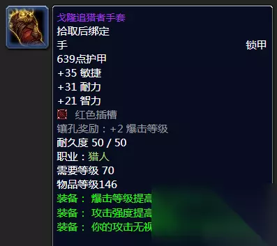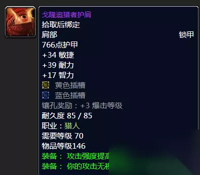 戈隆追猎者护肩 肩部装备前面说了考虑出4T6套装效果的话,那么这款戈隆追猎者护肩必然是要入坑的,高敏捷高耐力不俗的智力都是不错,黄蓝双色查查附送3爆击可谓不错。攻强搭配126点的无视护甲来说着实是香! 啵......NICE! 戈隆巨眼肩膀你值得拥有,推荐指数满天星辰直戳天花板,我戳我戳我戳戳戳! ④披风