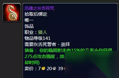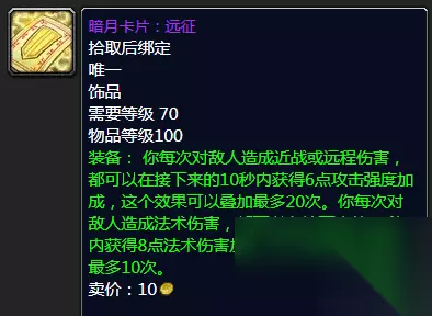 暗月卡牌远征 饰品方面的话喵叔个人比较喜欢以及推荐的要属于龙脊奖章搭配背叛者的疯狂了。性价比不错,当然对于一般玩家也可以入坑暗月卡牌远征以及声望的迅捷之灰舌符咒,虽然说迅捷之灰舌符咒的触发一直被人诟病,但是总体来说性价比可以,还是能用用的。 ⑬武器