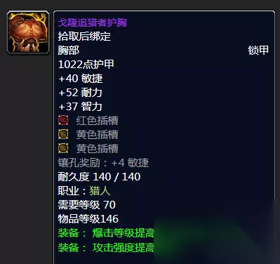 戈隆追猎者护胸 胸部装备来说的话喵叔首推肯定还是T6戈隆追猎者护胸的,属性相符插槽可观攻强爆击都还可以,出T6效果的话也要。当然对于部分散件流玩家其实大家也完全可以入手以下这款阿克蒙德出品的午夜胸甲。