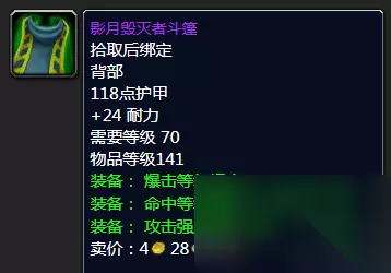影月毁灭者斗篷 黑暗神殿BOSS血魔出品的影月毁灭者斗篷的话堪称物理系BIS的披风都丝毫没有问题,对于破甲流的猎人来说更是非常的需要,本身还自带24点的耐力可谓是血线的保障,高爆击强命中以及不俗攻强真的无可挑剔值得喵叔戳天花板,我戳我戳我戳戳戳! ⑤胸部装备