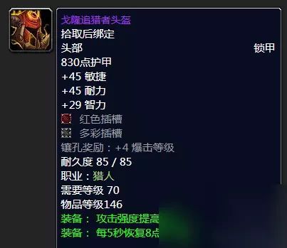 戈隆追猎者头盔 既然4T6是必须的,那么大家应该知道喵叔选择了抛弃头部装备戈隆追猎者头盔,大家其实也可以对比下二者,毫无疑问我们的萨格拉斯的诅咒视界完胜,但是有点还是要说在前面的,就萨格拉斯的诅咒视界来说P3竞争是肯定大的,毕竟盗贼、增强萨甚至是战士都可能会选择入手,所以也要提前做好准备。