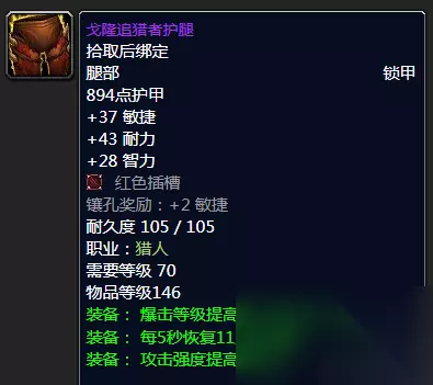 戈隆追猎者护腿 腿部装备来说的话其实也是有很多玩家争议的一点,因为很多玩家会选择头带T6,而腿的话选择下面这款阿兹加洛出品的弯弓护腿。