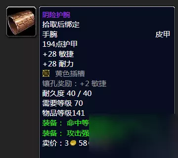 闪电反射护腕制皮材料 当然如果你P3还不考虑急速的话,那么这款出自于黑暗神殿BOSS血魔的阴险护腕也是非常不错。自带插槽高敏捷高命中高攻强,可以考虑入手。